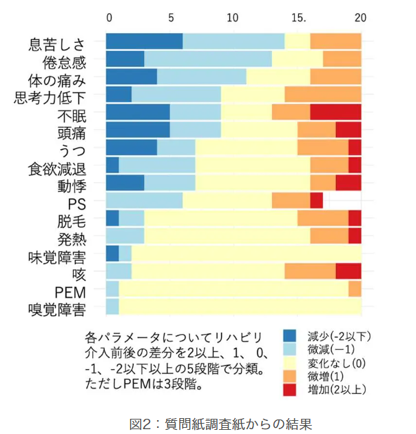 調査の結果、コロナ後遺症特有の症状である呼吸苦、倦怠感、体の痛みが改善する可能性が示された。また、質問紙調査とスマートウォッチデータの相関解析により、不眠と起床時間の関連性が確認され、スマートウォッチデータが症状変化の客観的な指標として利用できる可能性も示唆された。