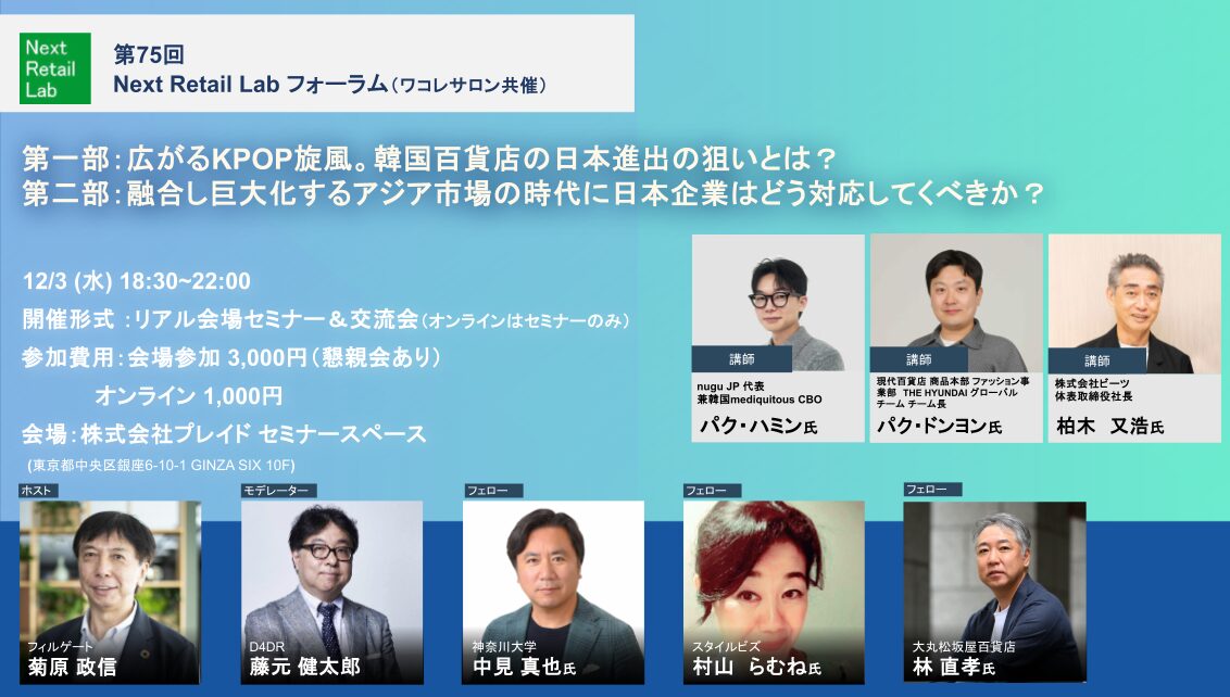 Next Retail Labが主催するNRLフォーラム第75回は、第一部と第二部に分けて、韓国やアジア市場といったグローバルなテーマで開催いたします。