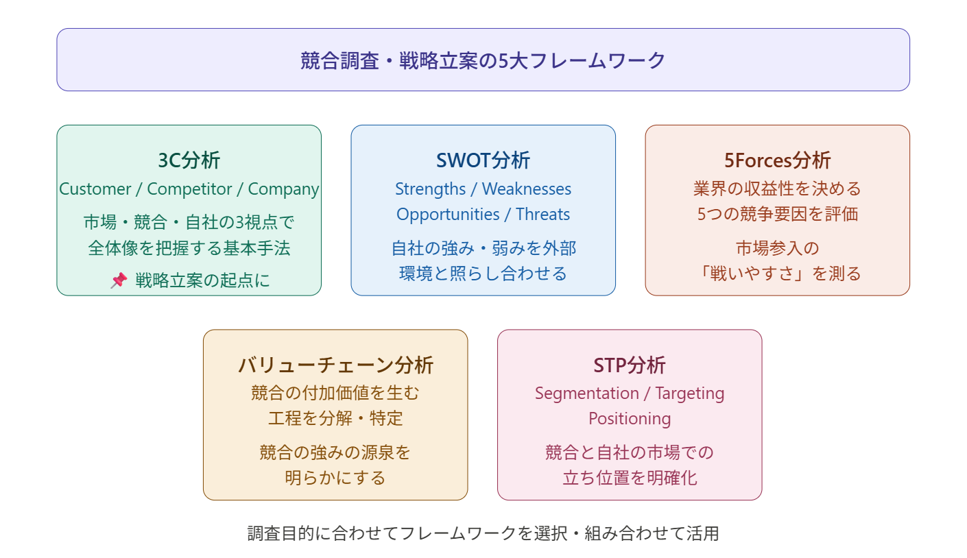 以下では、競合調査、戦略立案によく用いられるフレームワークを紹介します。