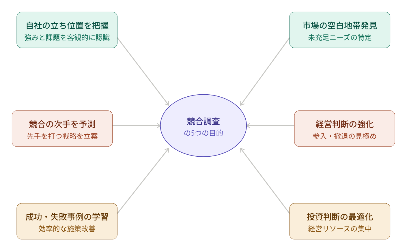 競合調査を行う目的は、大きく分けると以下の5点です。