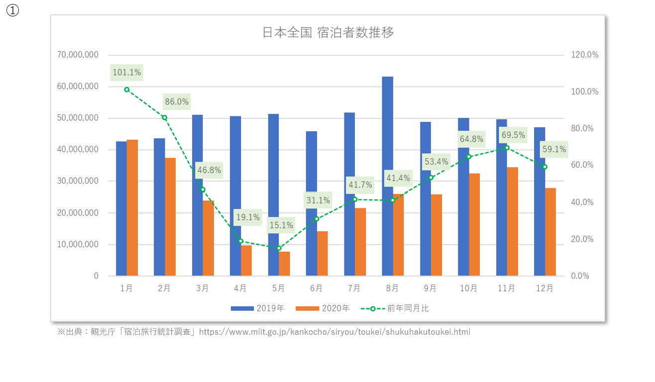 前月同様、まずは観光庁における都道府県別宿泊者の統計データを確認する。全国的な感染拡大を受けて、月末からGoToトラベルが全国一斉で停止された12月。前年比7割と回復途上だった宿泊利用は再度減少に転じ、前年の59.1%となった(図1)。